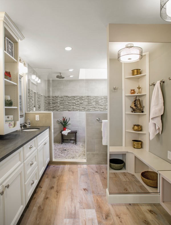 Bernhardt goes back to quartz. "It can be used in bathrooms, even on shower walls, as opposed to tile and offers no grout, no cleaning and it does better with moisture," he says. "Any time you have grout, over time it can discolor or if it comes out, water can get behind it, which you don't want to happen."