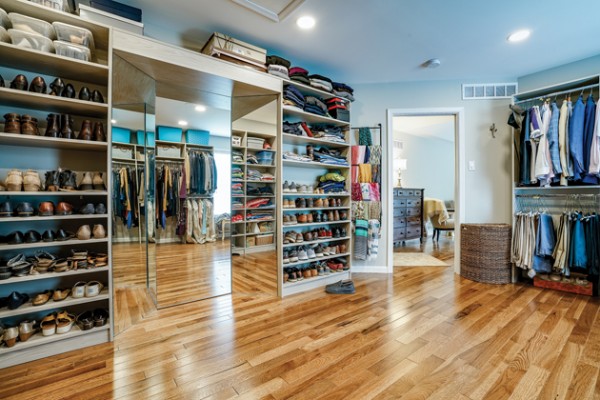The couple was willing to sacrifice one of the home's five bedrooms in order to add a third bathroom and a sprawling walk-in closet. Gehman's team suggested adding the new guest bathroom by claiming unutilized overhead space in either the foyer or the family room; using the family room was ultimately nixed because all parties agreed it would detract from the elegance of a two-story fireplace.