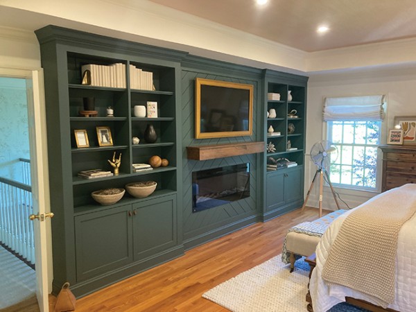 The partners further recommend bookshelves on each side of the fireplace. This can make a primary bedroom look as cozy as possible, and add an element of personal flair with the books that are chosen. While some may be partial to having their books alphabetically organized, organizing them by color is an easy way to customize a space. This will also work with now-old-school DVDs, CDs and vinyl albums, which have re-emerged in popularity. Experiment with creating a symphony of color, texture, design and functionality.