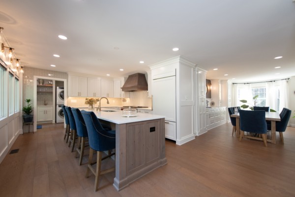 Amiano & Son took this Shamong, N.J. client's home from dark and dated to bright and warm, with natural wood floors and crisp white contrasts. By opening up the kitchen and dining room, it created a more practical layout that's perfect for entertaining.
