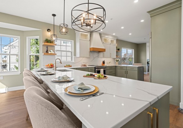 This redesign replaced the original single-wall layout and small eat-in nook with a center island featuring a marble waterfall edge and sage green shiplap base, creating a natural gathering spot for family and guests. New light, white oak slab-front perimeter cabinets paired with brushed brass hardware, statement pendants and swing-arm sconces bring warmth and sophistication throughout. A full-height Calacatta marble backsplash behind the range, under-cabinet lighting and a gold bridge-style faucet complete the elevated look.
