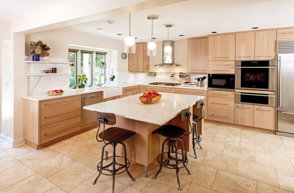 Offering unique hardwoods and designer finishes, Let's Face It award-winning full-service specialists helped transform this kitchen. Notable improvements included a full refacing upgrade of the existing kitchen including the use of modern flush maple doors. To help complement the redesign, a new island was also built and added to the space.